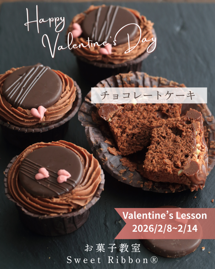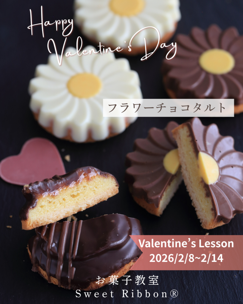 2026バレンタインレッスン3種類の中では初心者向けのメニューです。お花型で作るチョコレートタルト。タルトの土台はクッキー生地とチョコレートと相性のよいヘーゼルナッツクリーム。土台のタルト生地を焼成後、お花型にチョコレートを流し型どりします。お花型の他にキャラメルをのせてチョコレート掛けをしたキャラメルナッツタルトも作ります。ホワイトチョコのフラワー、ミルクチョコレートのフラワー、キャラメルナッツタルトを3個ずつを作ります。*キャラメルの実習はありません。レッスン詳細はこちら
