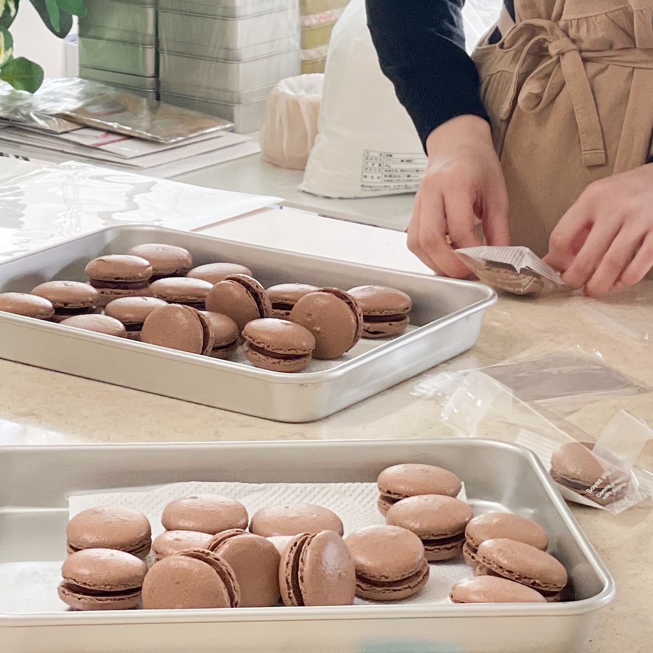 | 内容 | スイートリボンのレッスンメニューの中でも特に人気の高いマカロン。初心者さんでも、ぶきっちょさんでも上手にできるように工夫しています。ココア入りのマカロン生地にガナッシュ(生チョコ)を挟んだマカロンを作ります。クリスマスのラッピングでお持ち帰りいただけます。 |